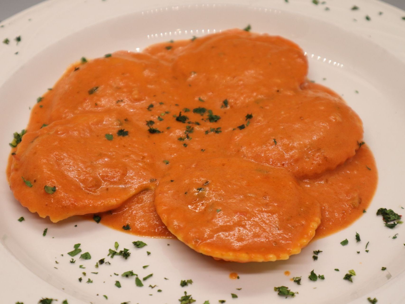 Pancetta with creamy tomato and vodka, parmigiano cheese.,